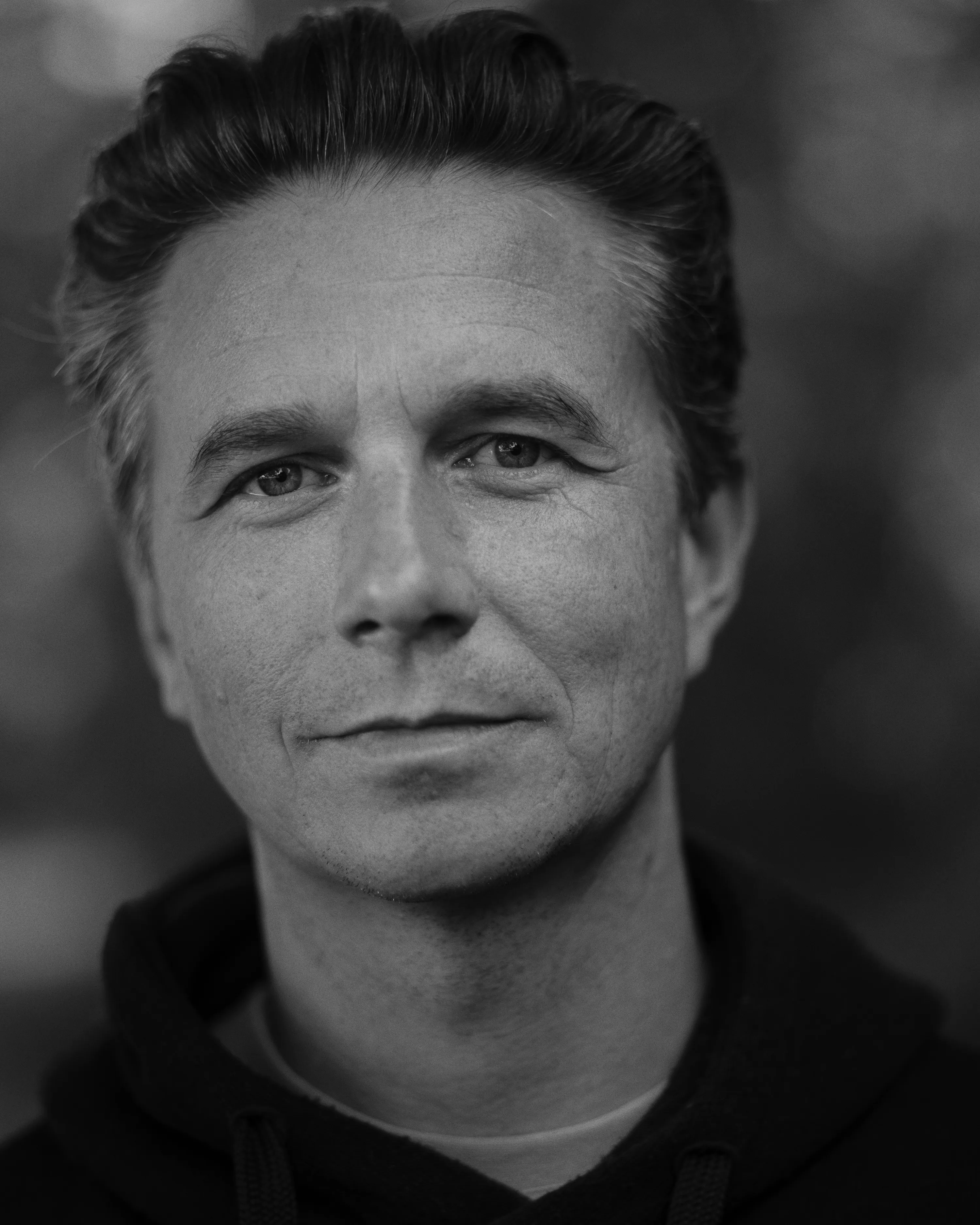 Danish musician and composer Mike Sheridan in an outdoor nature shoot b&w