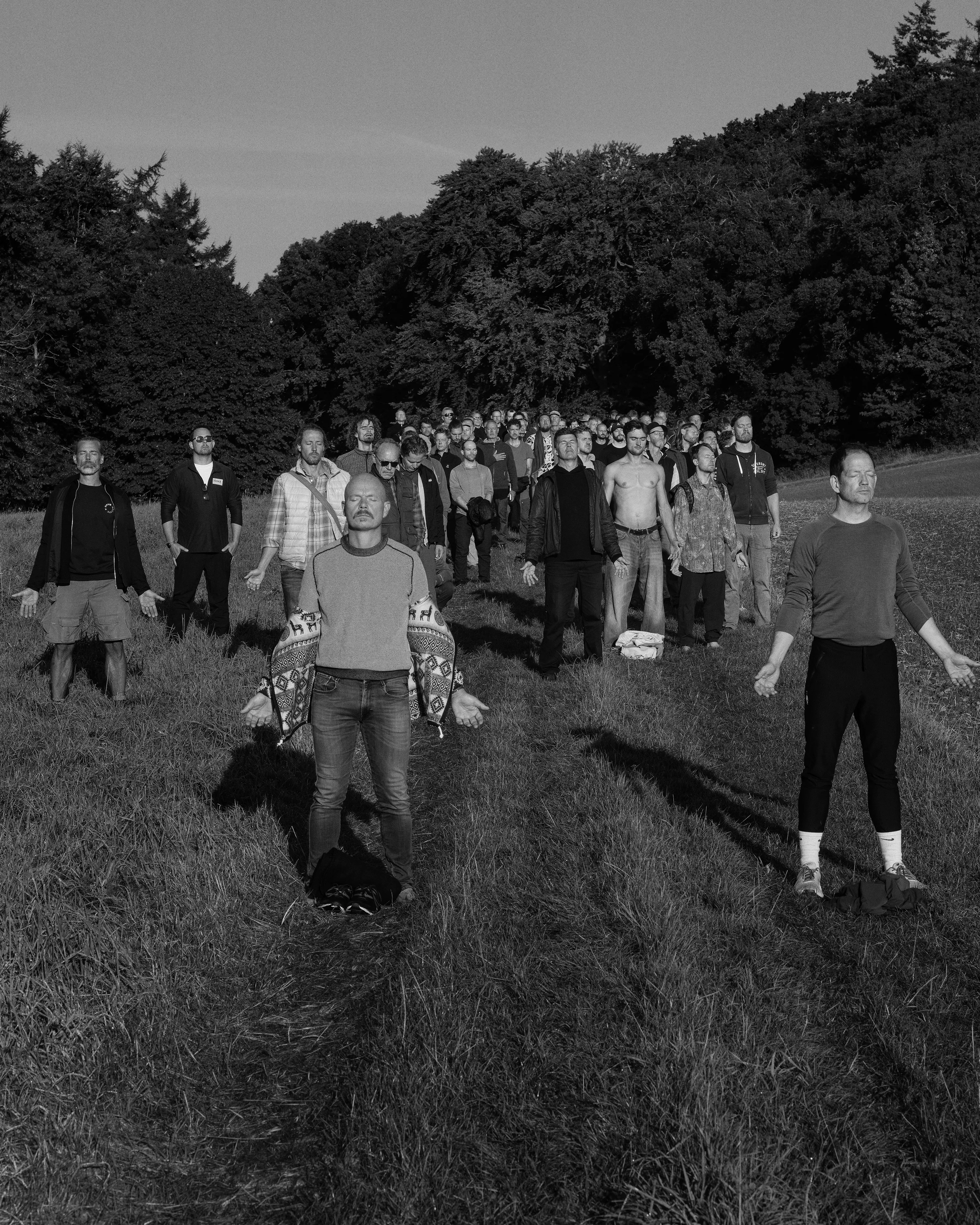 a cool looking model backstage at fashion show posing in Henrik Vibskov jaked and a bare torso covored with tatooes